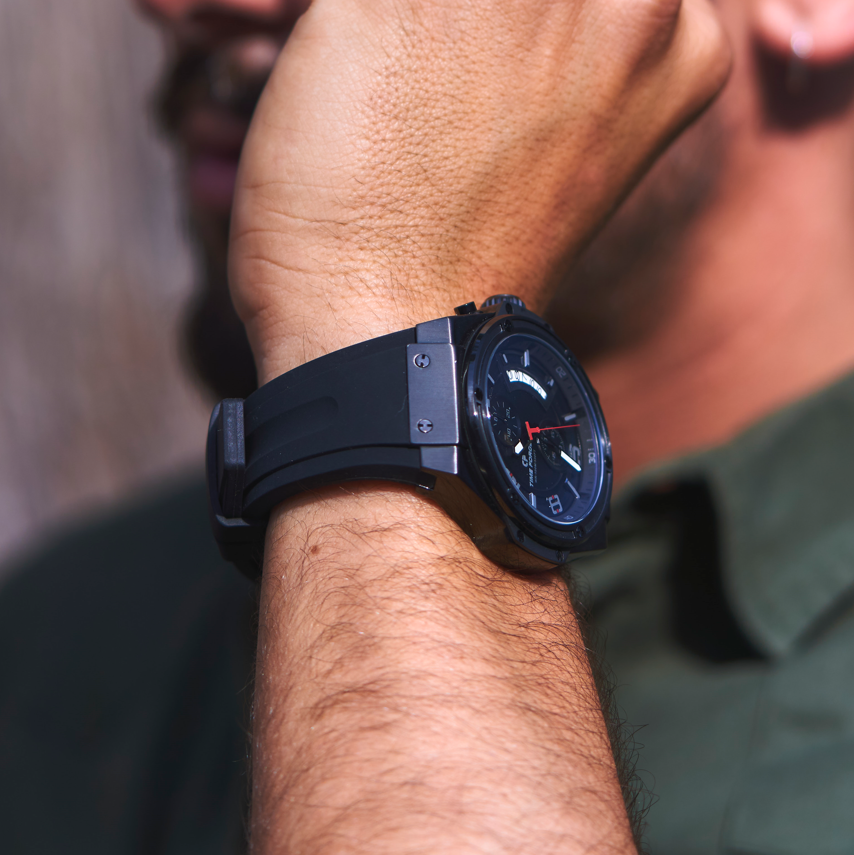 Sporty at its core, the VORTEX embodies everything one should aspire to in a sports watch: chronograph function, large numbers, a rugged dial, visually intuitive sub-dials, and a partial view of the vortex-like calendar framed with a brushed finish. As a silicone-native watch, its sole purpose is to evoke premium sportiness.