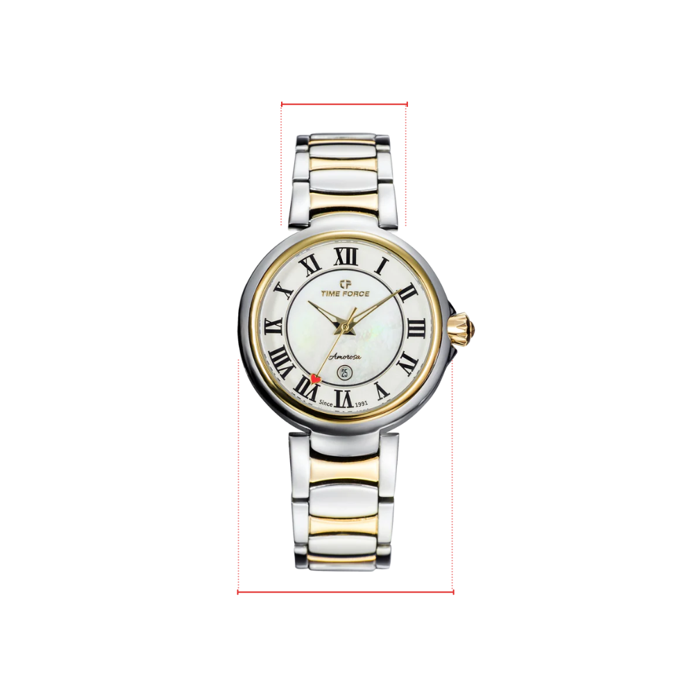 The Amorosa watch is crafted from 316L stainless steel, a durable material that retains its shine and sophistication over time. Additionally, it features a PVD steel treatment, enhancing its durability and appearance. This model combines strength and elegance, designed to last and stand out on any occasion.