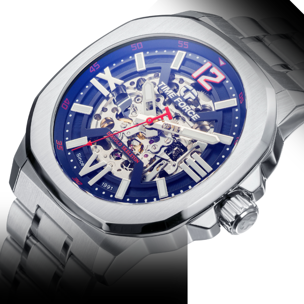 It stands out with the vibrant blue visible through its sapphire-treated crystal, a classic design with a modern twist. Diavolo Skeleton reveals the art of the Japanese 82S7 movement through its skeletonized dial.
