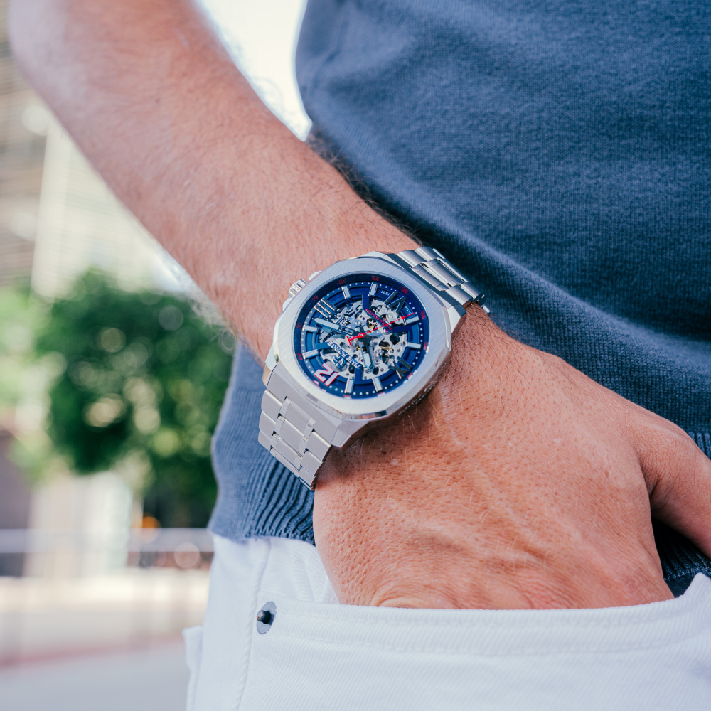 It stands out with the vibrant blue visible through its sapphire-treated crystal, a classic design with a modern twist. Diavolo Skeleton reveals the art of the Japanese 82S7 movement through its skeletonized dial.