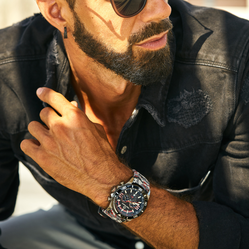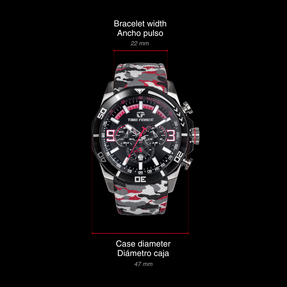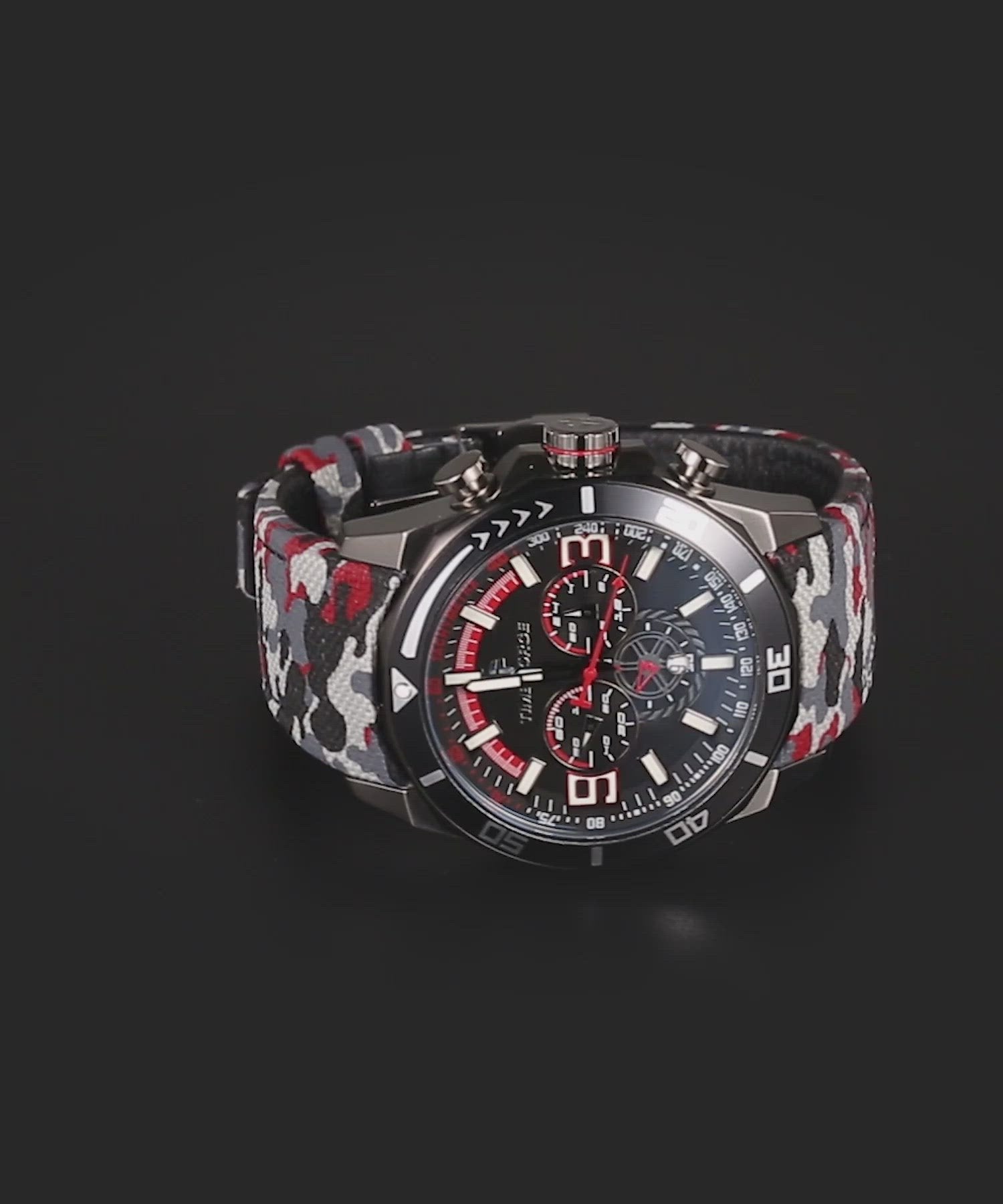 This watch goes beyond the traditional and invites you to be part of challenging adventures, with its camouflage strap in military colors (gray, red, black, and white), made of nylon and covered in black leather. Designed for all situations, this edition also includes an additional black silicone strap. Additionally, it features a comfortable folding clasp that adds a touch of elegance and ensures absolute comfort.