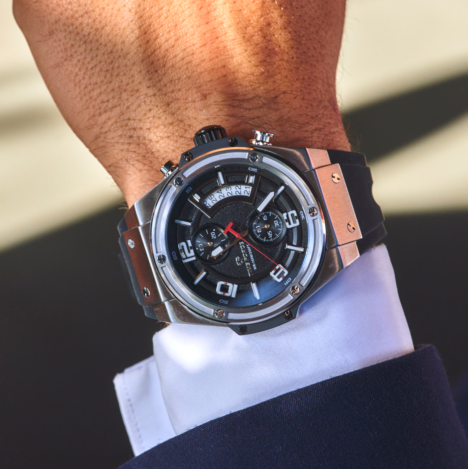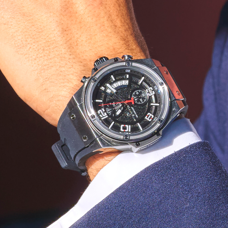 Sporty at its core, the VORTEX embodies everything one should aspire to in a sports watch: chronograph function, large numbers, a rugged dial, visually intuitive sub-dials, and a partial view of the vortex-like calendar framed with a brushed finish. As a silicone-native watch, its sole purpose is to evoke premium sportiness.